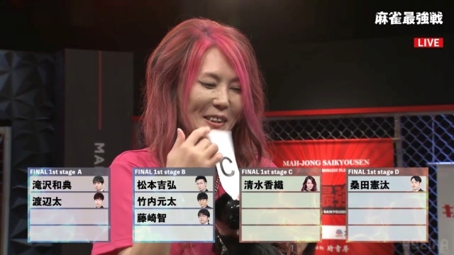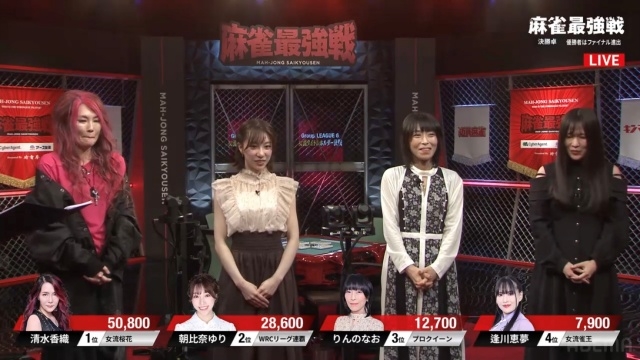 その模様はAbema麻雀チャンネルにて生配信され、ドラの先切りを連発して他家を翻弄した清水香織プロが優勝した。