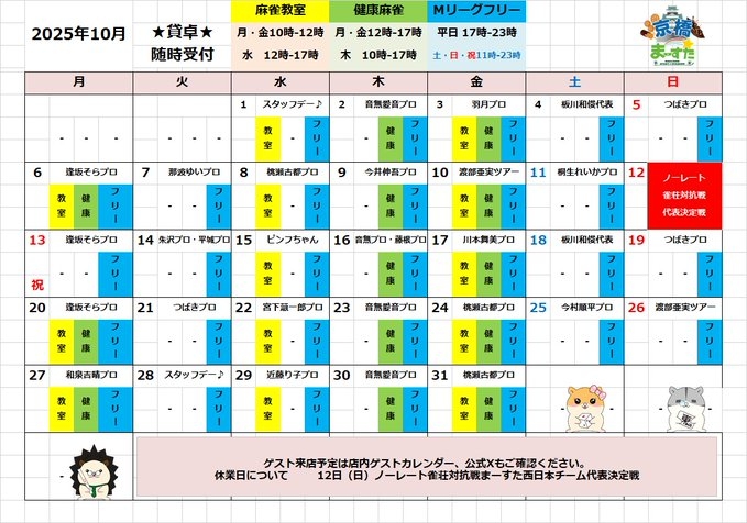 12日はノーレート雀荘対抗戦まーすた西日本チーム代表決定戦のためフリー・セットはお休み